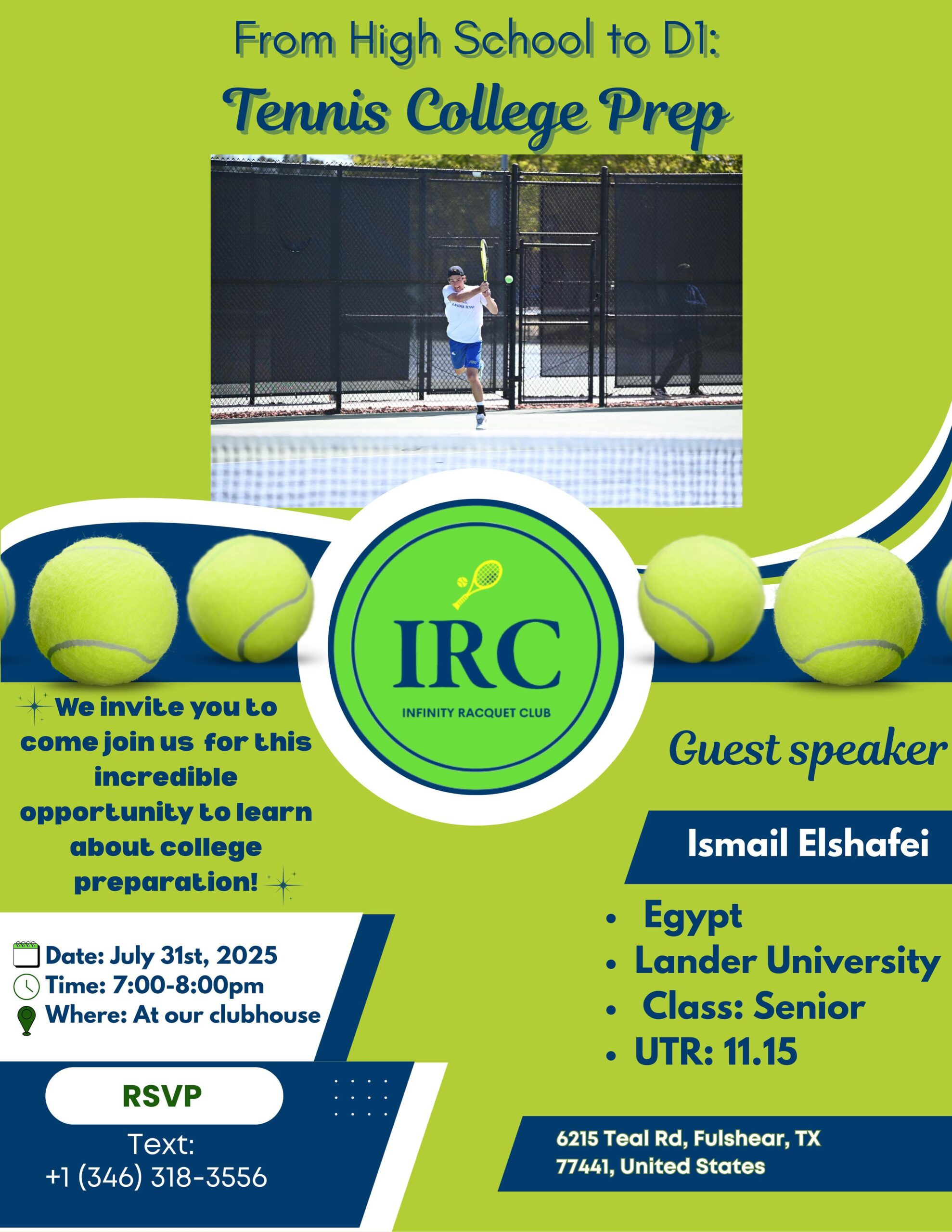 July 31 @ 7:00 pm - 8:00 pm College Tennis Prep Talk IRC 6215 Teal rd, Fulshear our second College Tennis Prep Talk is happening this Thursday, July 31st, from 7:00–8:00 PM right here at the *IRC clubhouse! *🏠🎾 This is a […]